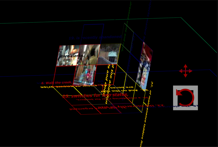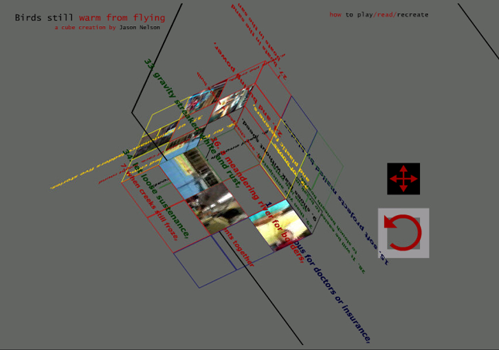 Birds Still Warm from Flying consists of interactive poetry cubes allowing multi-linear/dimensional play and reconfiguration. One possible reading is as 3-dimensional concrete poetry sculpture generator. The cube interface allows the reader to move the interface in 3-dimesional space, with the all elements placed on the cube transforming in proportion to the cube’s movement, perspective and warping is reasonably maintained as the cube is moved. Furthermore, each of the rows and columns can be moved to further recreate the placement and graphical nature of the poem. Each of the sides of the poem are colour coded to give the reader a reference point for the initial configuration of the interface, so changes become more apparent.