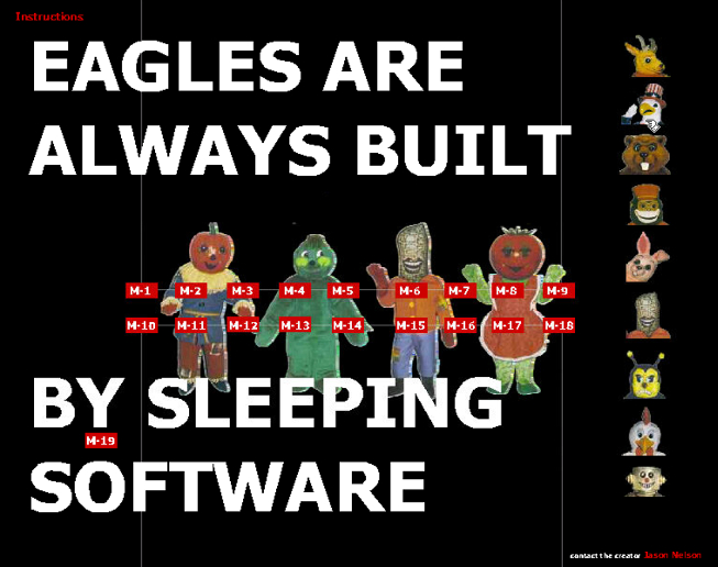Evil Hypnotizing Mascots features algorithmic driven mascots. Hypnotizing stuffed and evil creatures. This is both humourous threat, and creepy absurdity. Oddly addictive to watch and watch and listen. Choose your favorite mesmerizing mascot and then use the center buttons to release their duplicating and re-morphing power. This project is a modified version of another creation called 'An Introduction to the Study of Hypnotism,' which explored shapes instead of mascots.