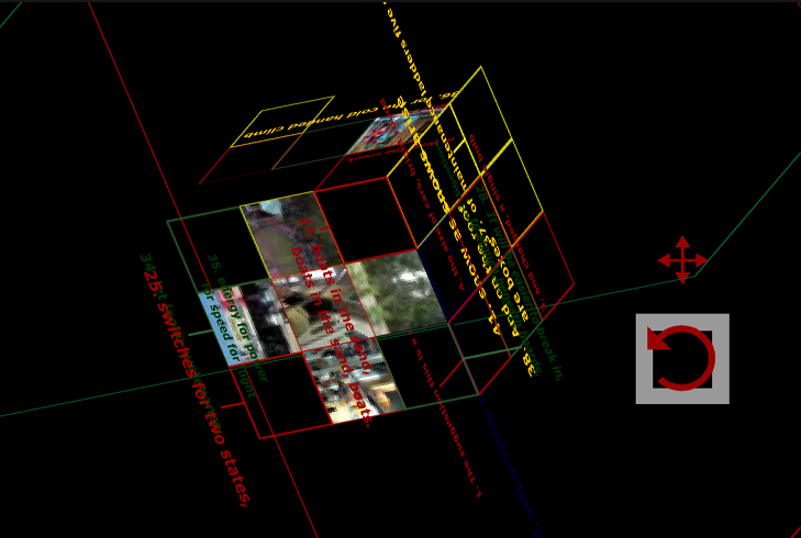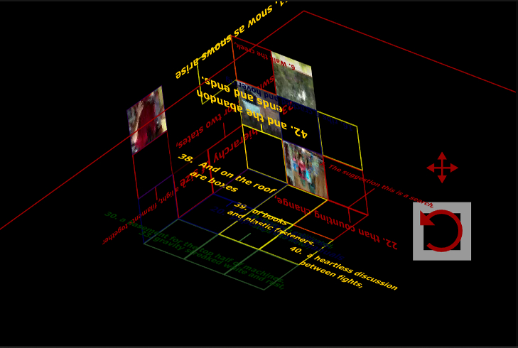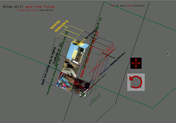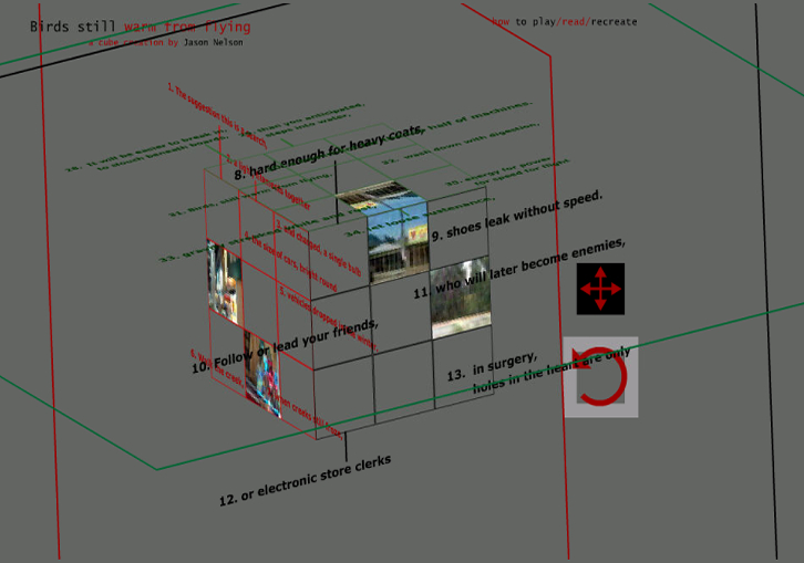 Birds Still Warm from Flying consists of interactive poetry cubes allowing multi-linear/dimensional play and reconfiguration. One possible reading is as 3-dimensional concrete poetry sculpture generator. The cube interface allows the reader to move the interface in 3-dimesional space, with the all elements placed on the cube transforming in proportion to the cube’s movement, perspective and warping is reasonably maintained as the cube is moved. Furthermore, each of the rows and columns can be moved to further recreate the placement and graphical nature of the poem. Each of the sides of the poem are colour coded to give the reader a reference point for the initial configuration of the interface, so changes become more apparent.
