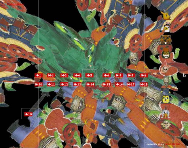 Evil Hypnotizing Mascots features algorithmic driven mascots. Hypnotizing stuffed and evil creatures. This is both humourous threat, and creepy absurdity. Oddly addictive to watch and watch and listen. Choose your favorite mesmerizing mascot and then use the center buttons to release their duplicating and re-morphing power. This project is a modified version of another creation called 'An Introduction to the Study of Hypnotism,' which explored shapes instead of mascots.